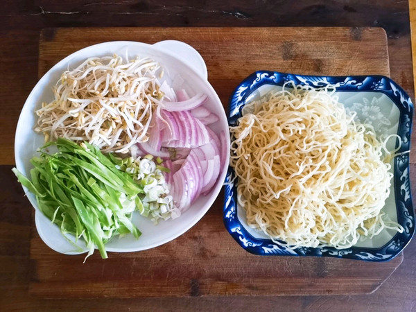 包菜洋葱切丝,豆芽菜洗净备用,葱切葱花