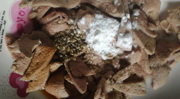加入配料:胡椒、酱油、料酒、淀粉搅拌均匀准备下锅。