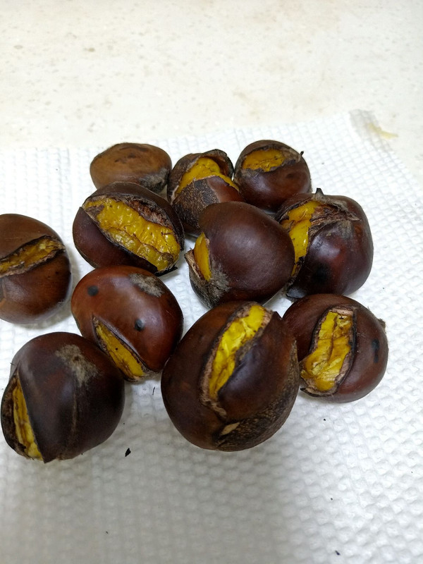 待锅底水分煮干,加少许食用油不停地翻炒,至表面水分炒干,板栗口子裂开,露出金黄肉肉。