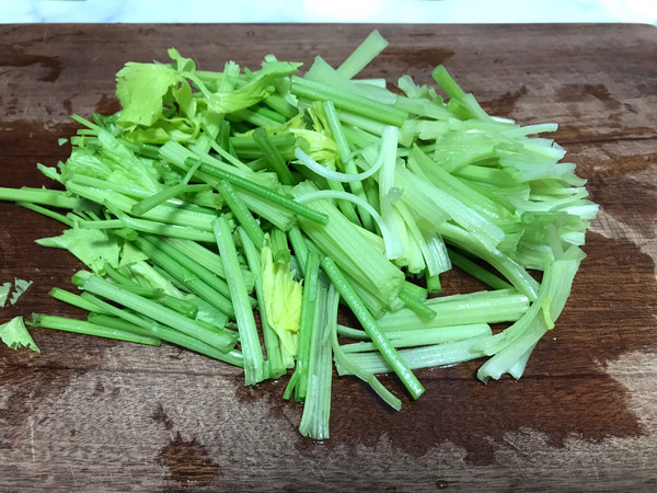 小香芹摘掉叶子,清洗干净后切成小段备用