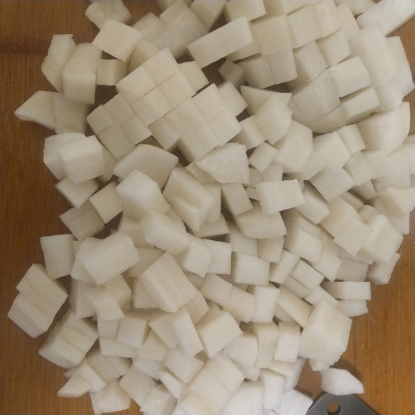 将切好的白萝卜放入盆中,加入盐腌出多余水分。