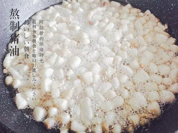 提前熬制猪油,小火慢熬,不要熬过头,刚熬出来的油是像水一样清澈,待冷却放冰箱冷藏保存,会凝成白色像雪一样洁白无瑕~(油渣变黄就要停止了~)