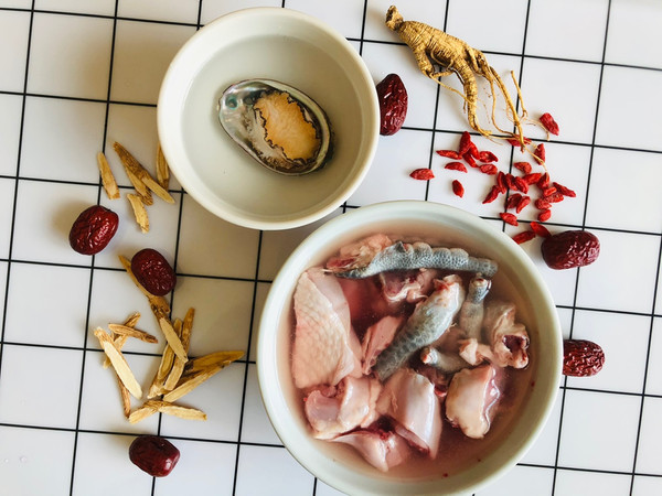 准备所需食材 鲍鱼 鸡肉 洋参 北芪 红枣 枸杞 「鸡肉用清水浸泡一会 泡出血水 。 鲍鱼 用清水浸泡出黑黑的杂质 再用刷子清洗干净」