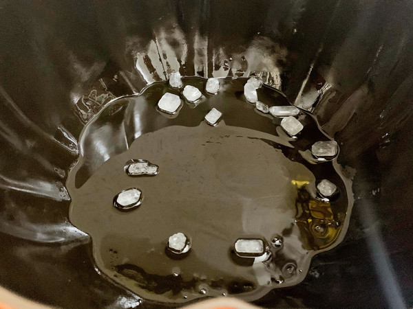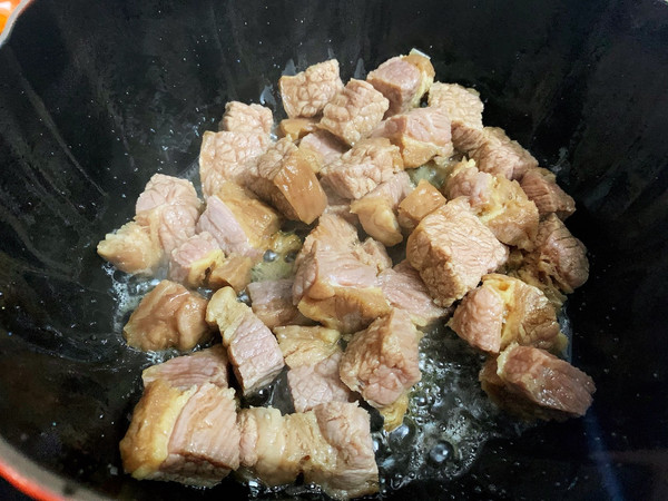锅中倒入适量的食用油烧热,放入冰糖,小火炒至融化变成焦黄色