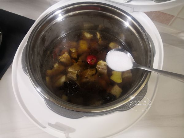 把炒好的牛肉块倒入臻米UFO饭煲压力锅FY1中,倒入没过食材一寸左右的开水,放入山楂和香叶桂皮。