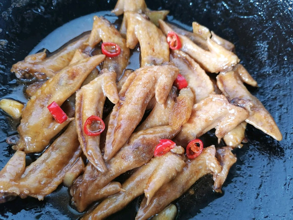 拍上成品图,一道酱香浓郁的红烧鸡翅尖就完成了。