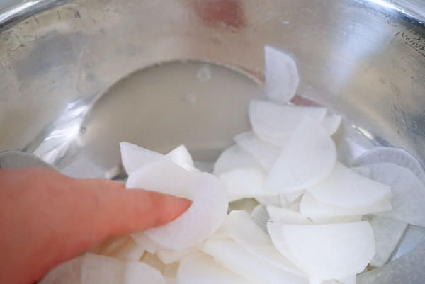 白萝卜一根,去皮对半切开后,再纵向劈成两半,切均匀薄片。