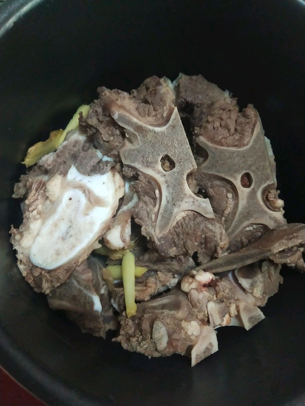 把洗干净的牛骨头放入清水的锅里煮一遍,去除血水