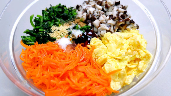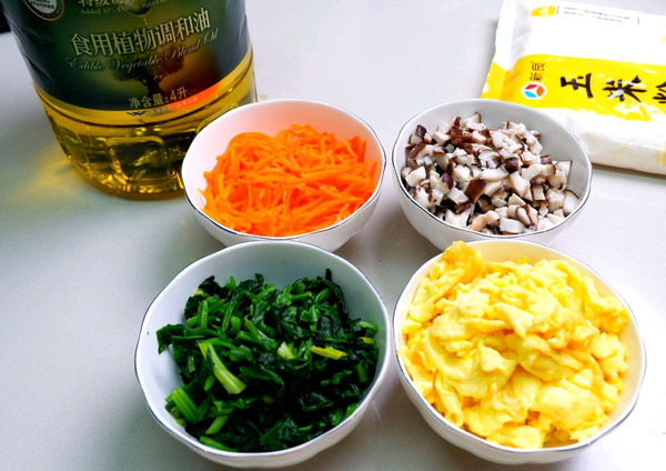将鸡蛋炒熟备用,红萝卜切丝焯熟,香菇切丁焯熟,菠菜焯熟切断放入碗中备用;