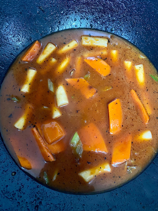 锅内少许油、倒入葱段(有洋葱的最好拿洋葱,1/4即可,切段倒入)