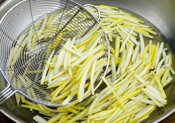 锅内倒入适量的水烧开后把浸泡好的柚子皮放入锅内大火煮1~2分钟关火捞出装盘备用。