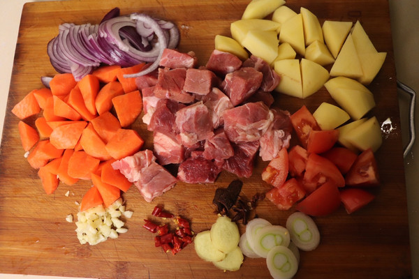 胡萝卜 、土豆 切滚刀 。洋葱 切丝 。西红柿切块。