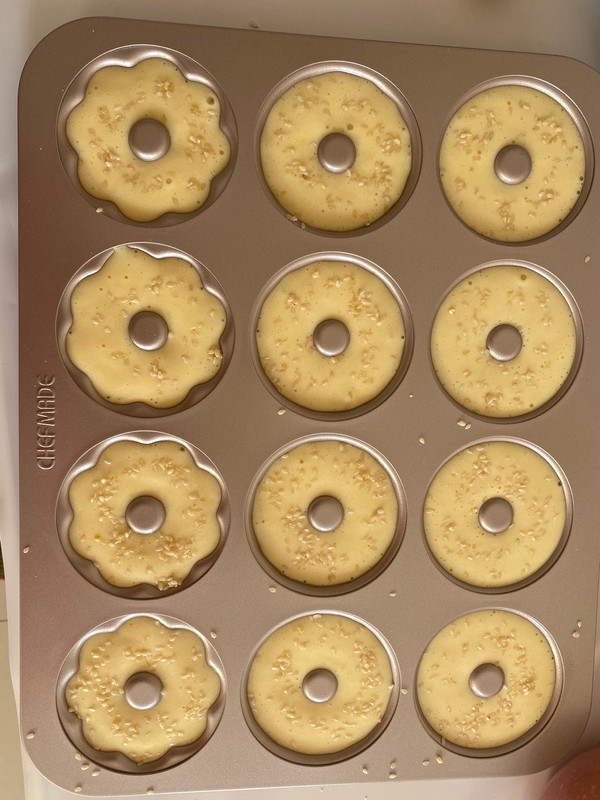 挤到模具中,撒适量白芝麻,烤箱提前预热,震两下入炉