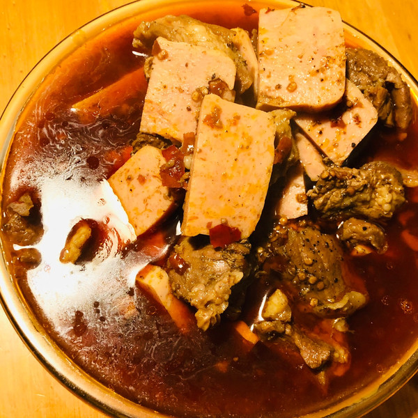 第五步:牛腩炖烂后放入好吃的午餐肉再煮个五分钟