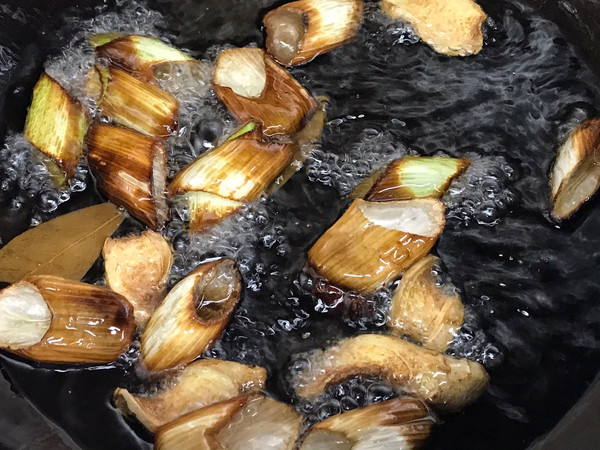 锅中凉油把大葱、姜片、香叶、大料放进去,小火慢慢加热,等香料颜色炸成枯黄色,就可以捞出来