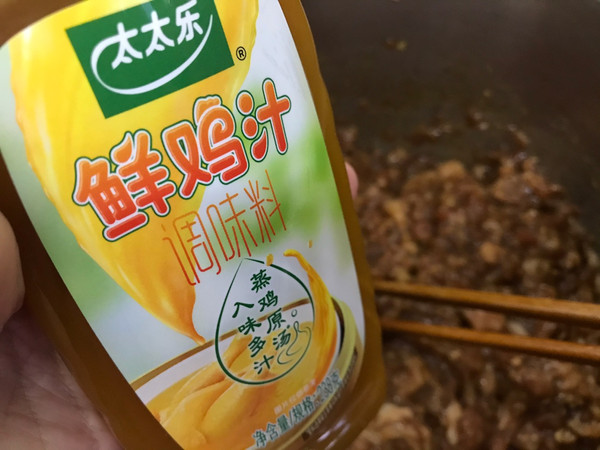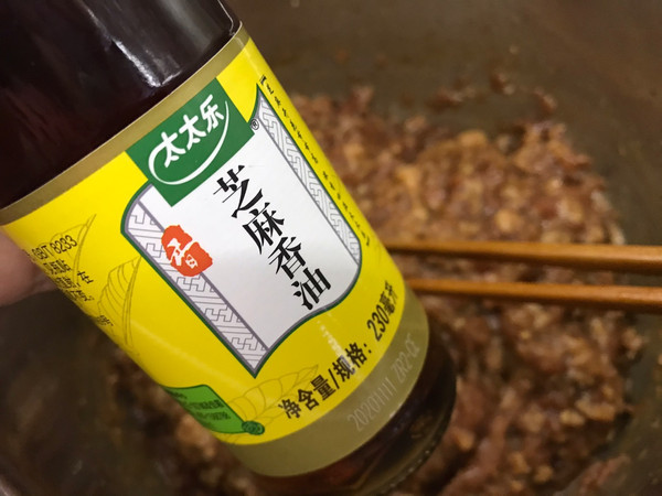 接下来就是加调味料了,如果懒省事,可以把所有调味料都倒进肉馅中,记得加上太太乐香油提升香气