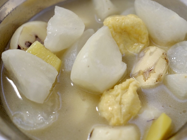 煮完的羊汤已很鲜,可以捞起一部分喝。 剩下的高汤看个人喜好,加入萝卜、马蹄等煮15分钟即可。