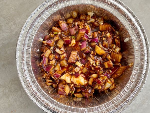 豆腐切块倒入锡纸盒中。一定要用嫩豆腐哦。
