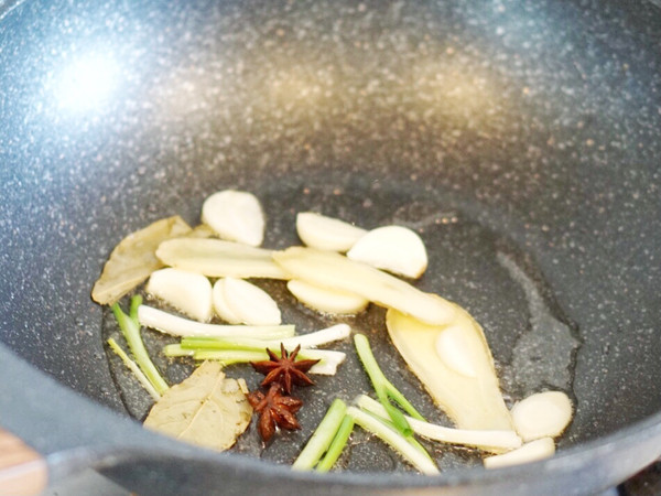 热锅冷油,加入葱白、蒜瓣、姜片、桂皮、香叶,小火炒出香味。