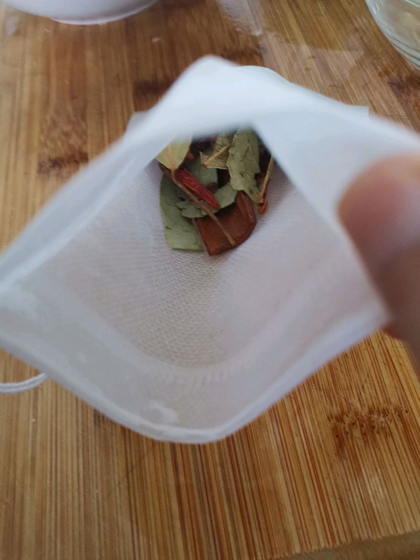 桂皮、花椒、干辣椒、香叶、八角、草果放入无纺布袋中备用。