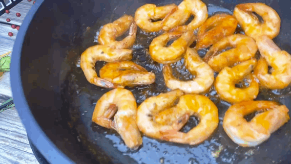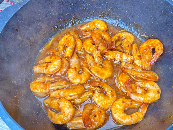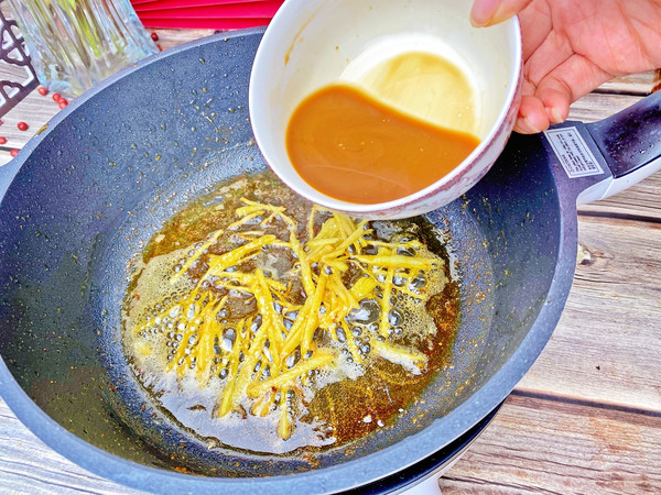 留些虾油在锅中倒入姜丝,葱煸炒出味,倒入调味汁,小火慢慢滚开。