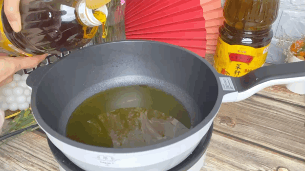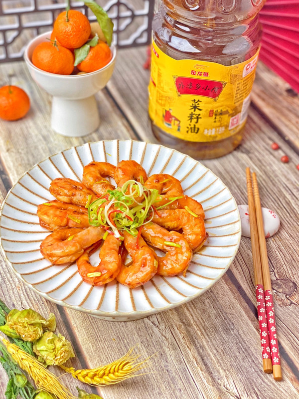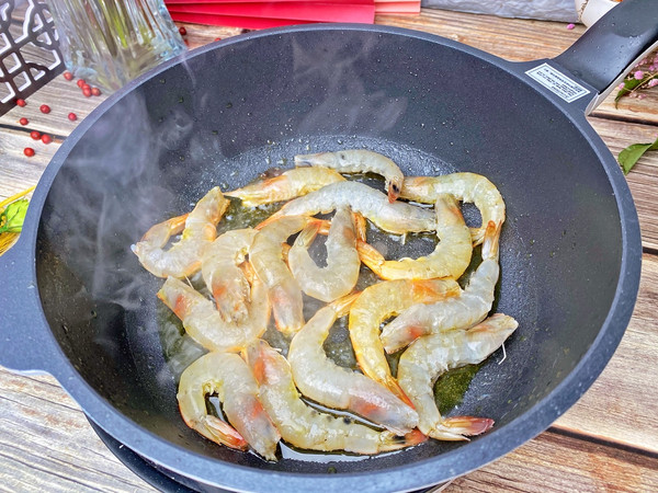 锅内倒入适量外婆乡小榨菜籽油,摇动锅子或推锅铲让油分部在锅内壁均匀加热,一定要热锅热油,油冒烟后再放入食材,可以轻松去掉虾的腥味;