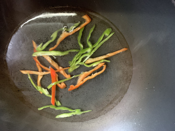 辣椒洋葱切丝,辣椒切丝焯水,洋葱丝备用