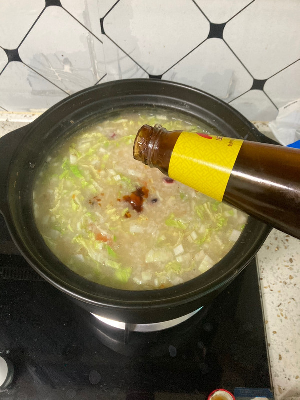 熬了半小时的粥,加入姜片,熬粥的时候不时用筷子搅拌一下,以免粘锅