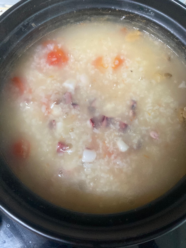 先加入鱿鱼、鲍鱼、最后加虾仁