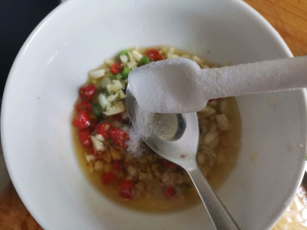 大蒜切成蒜末,小米椒切碎,葱白也切成粒