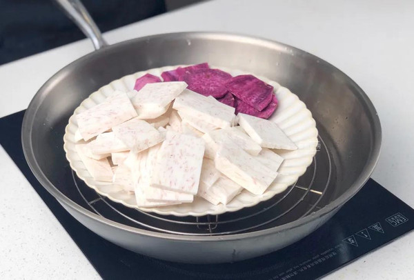 香芋和紫薯切片放入鹅妈妈钛晶锅中蒸熟(香芋益胃、健脾,含有较多的粗蛋白、粗纤维等,其蛋白质含量比一般高蛋白植物如大豆类都要高);