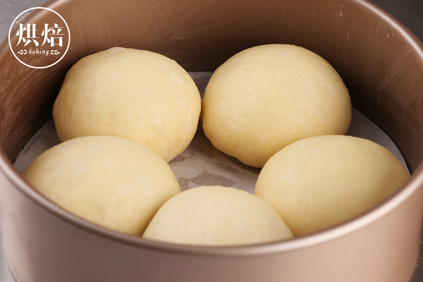 准备一个8寸的圆形不沾模具,底部铺上烘焙纸,四周刷一层黄油防粘,然后放入五个面团,放入发酵箱,30度\80%湿度。