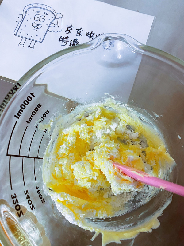 拌匀后加入蛋液继续拌均匀,拌到蛋液完全和黄油溶为一体即可;