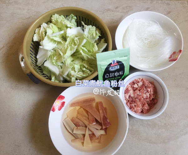 准备好食材,白菜洗净摘小块,粉丝用水浸泡一下,肉末、干鱿鱼洗净浸泡