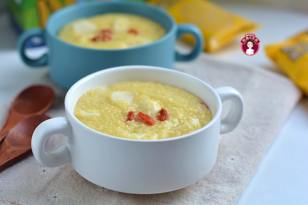 倒入熬出米油的黄小米粥中,再扔一撮枸杞,熬5分钟左右即可出锅;小米粥特别的浓稠而且有粘性,要不时地用勺子搅动防粘锅;