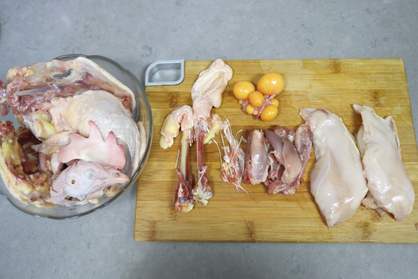 将鸡大胸取下,再将鸡大腿上的肉取下;这两处的肉用来做馄饨,在文末会附上做法;鸡蛋不宜久煮,先取出来后放;剩下的鸡架剁大块;