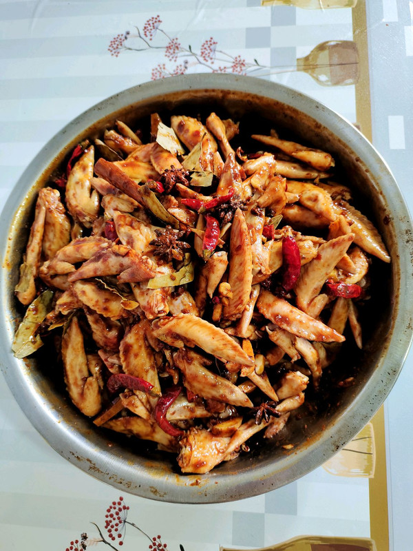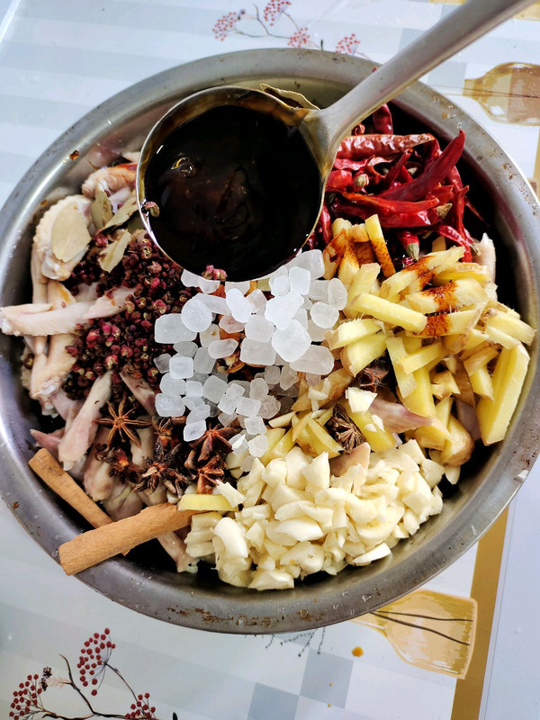 盆中放入八角1把,桂皮4个,花椒1大把,香叶1把,干辣椒1大把,生姜1大块切成小丁,蒜瓣1个剁成小丁,生抽3大汤勺,老抽1大汤勺,蚝油2大汤勺,冰糖1大把!