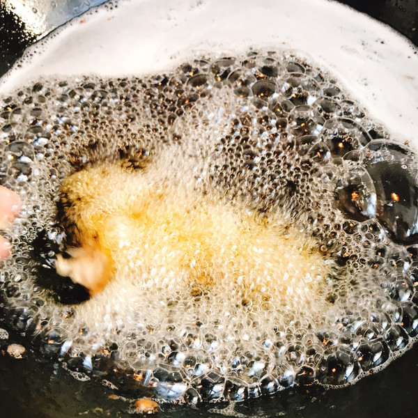 丸子入锅要低一点入锅,太高投到锅里容易溅出热油被烫到,炸制食物的时候一定注意安全!