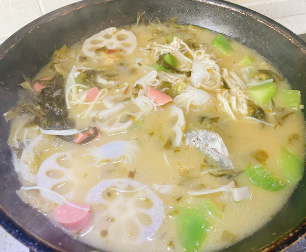 锅中加入油,把鱼骨鱼头煎一下。倒入开水,加入料包,蔬菜。