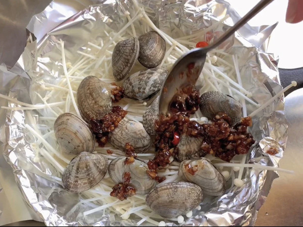 锅里铺锡纸,先放上泡发好的粉丝,再依次放上金针菇和花甲。