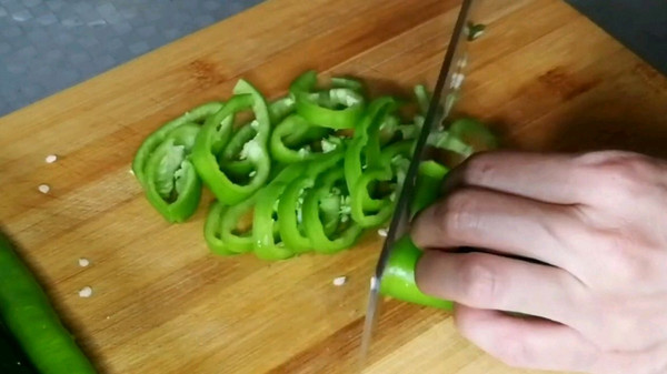 青椒切成圈儿,一会儿卷肉的时候放在里面,可以解腻清口,