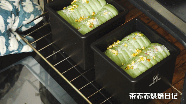 然后二次发酵40分钟左右,到模具的8-9分满的状态,表面撒上些开心果碎和椰蓉