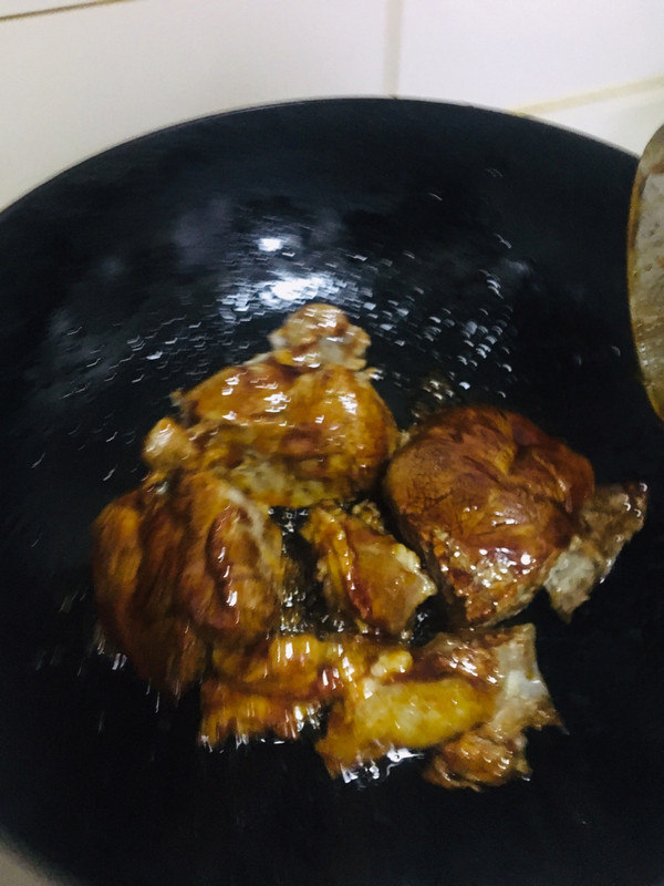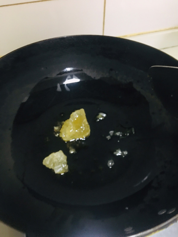 锅中加入2勺油,放入2块冰糖,熬出糖色