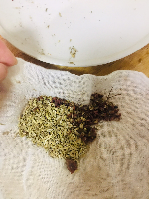 锅中放入八角、桂皮、陈皮、姜片、大蒜、干辣椒还有纱布包好的卤料包放入锅中煮20分钟