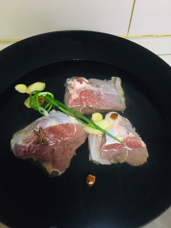 冷水下锅,放入料酒、生姜片、1个八角、葱结
