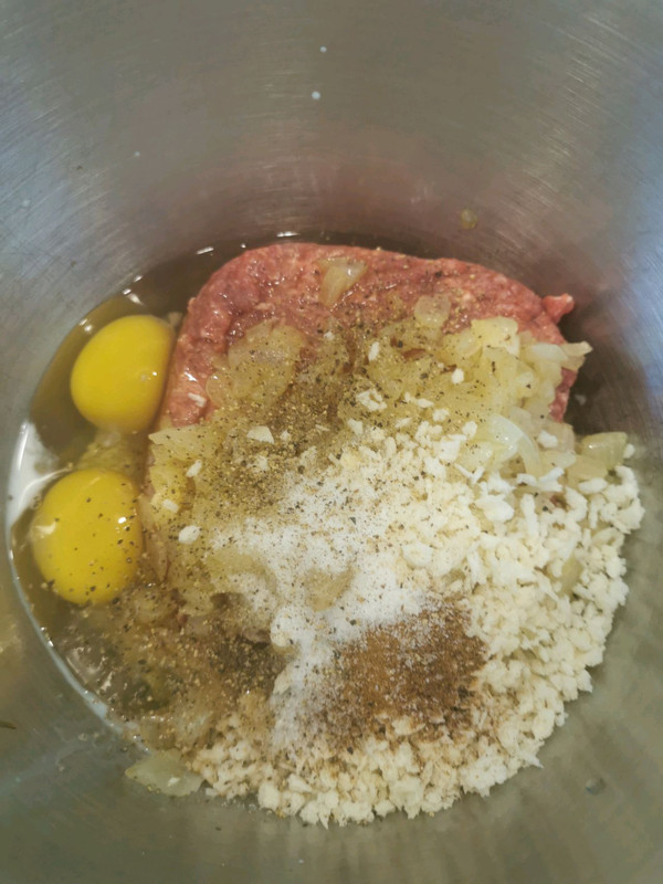 把牛肉末,猪肉末,一半炒好的洋葱,一个鸡蛋,50牛奶,2.5g肉蔻粉,少许黑胡椒粉,5g盐,5g伍斯特沙司,放入碗里