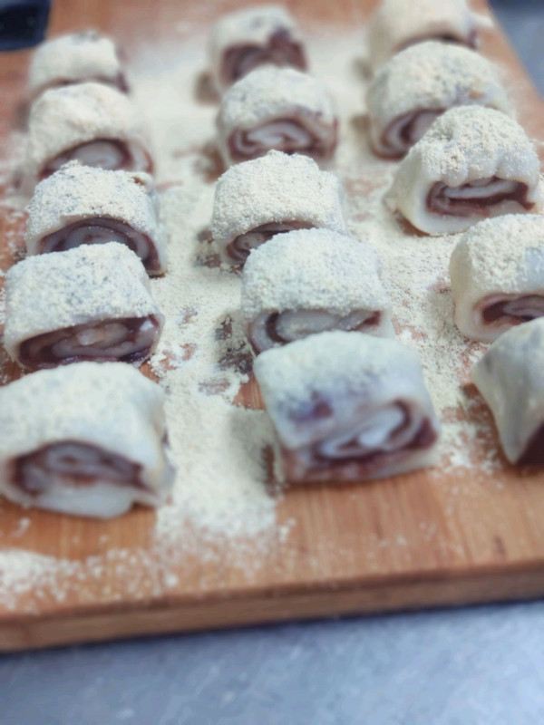 面板撒熟黄豆粉,取出面团,两面沾粉擀成长方形面皮,铺一层红豆馅