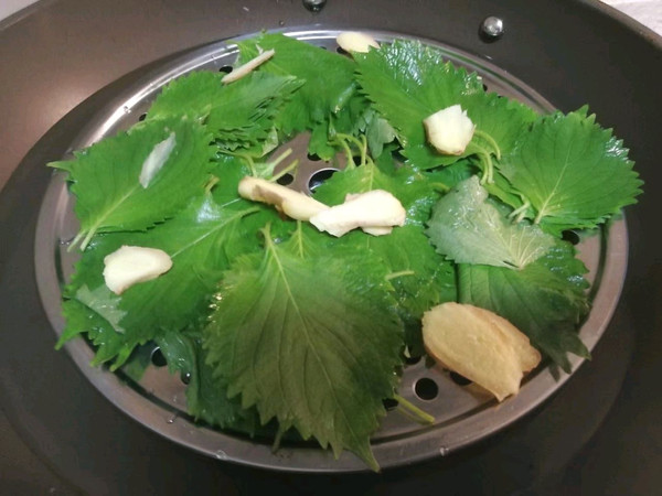 蒸锅内加入适量水,放入生姜片,蒸架上铺满紫苏叶。