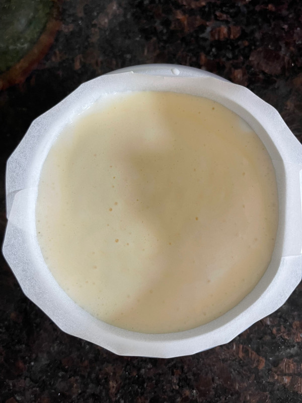 烤箱托盘加水预热 150度上下火 将硅油纸裁成合适的形状铺在模具的一周和底部
