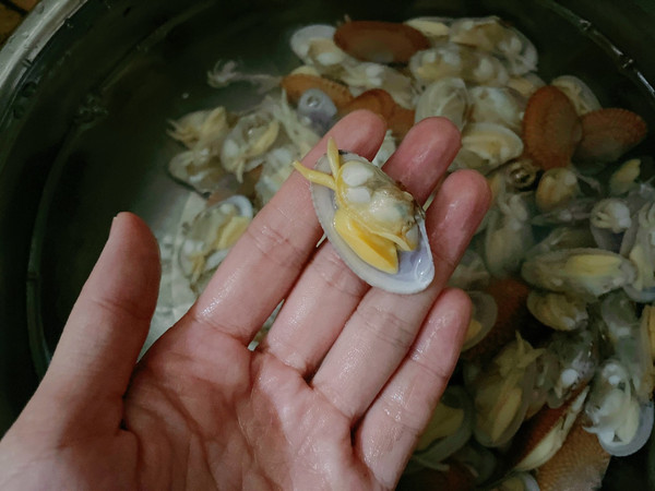 掰掉另一半没肉的壳,看一下有没有沙,清洗干净,沥干水分。